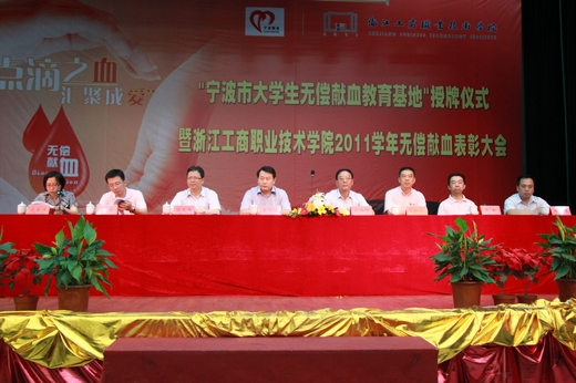 | 为进一步推动学校无偿献血工作,6月15日下午,学校2011-2012学年无偿献血表彰大会暨宁波市首个大学生无偿献血宣传教育基地授牌仪式在我校隆重召开。宁波市卫生局局长王仁元,市教育局副局长陈文辉,市教育局学校安全与体育卫生艺术教育处处长蒋和法,市献血办主任、血站站长张哲,血站副站长黄凯,海曙区卫生局局长助理徐和青以及我校党委书记蔡泽伟,党委副书记应金萍,宁波市各高校团委书记、红十字会会长等30多名领导出席本次大会。
