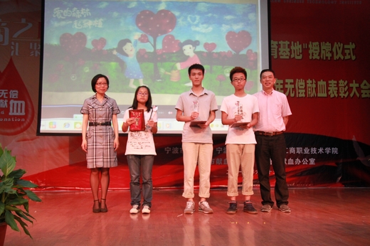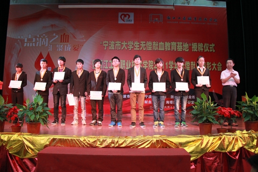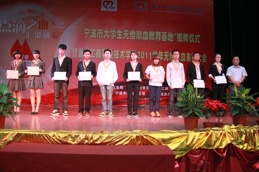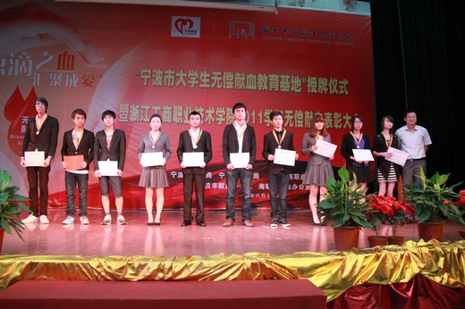 大会期间,王仁元和蔡泽伟分别代表宁波市卫生局和我校进行了大学生无偿献血教育基地的授牌。授牌仪式结束后,主席台领导现场对2011-2012年度无偿献血涌现出的2个先进集体、39个爱心班级、14个爱心寝室、60个无偿献血奉献奖获得者和10位无偿献血志愿服务工作者进行了颁奖。我校无偿献血金奖获得者徐炯波和全国无偿献血奉献奖金奖获得者冯闯在活动中代表全市献血者进行发言。学生代表还向无偿献血先进教师代表、学生代表、市民代表进行了献花。活动在庄严的宣誓和《爱,因为在心中》的歌声中成功落下帷幕。