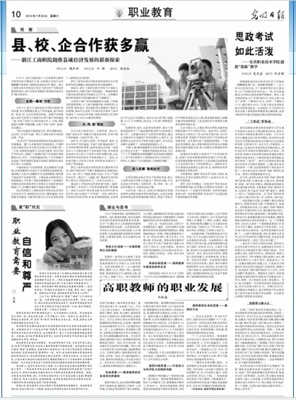 | 近日,在相关部门的努力下,《光明日报》2012年07月28日“职业教育”版发表了题为《浙江工商职院助推县域经济发展的崭新探索》的半个版面的文章,专题报道了我校助推县域经济发展开展的总部—基地办学和县校企合作的内容,引起了社会的广泛关注和较大的反响。 县、校、企合作获多赢 ——浙江工商职院助推县域经济发展的崭新探索 《光明日报》2012年07月28日 职业教育版
