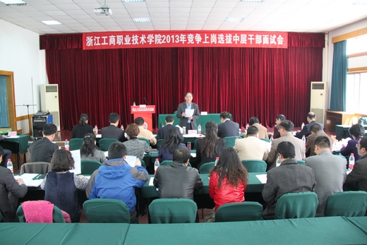 | 4月10日下午,学校2013年竞争上岗选拔中层干部面试会在学校至诚楼一楼会议室举行。省商业集团有限公司组织人事部副部长黄胜泉、校党委书记蔡泽伟、校长谢一风、副校长姚奇富、党委副书记应金萍、纪委书记李振祥、副校长俞位增、副校长徐永春、党委委员邱素芬等领导出席会议,学校6个党总支推荐的18名干部和教师代表也参加了此次面试。