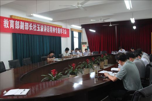 | 根据浙江省教育厅办公室关于组织学习讨论杜玉波同志《以立德树人为根本使命,全面推动高等教育内涵式发展》讲话的通知精神(浙教电传[2013]217号)。6月8日上午,学校党委在至诚楼三楼会议室召开中心组(扩大)学习会议,专题学习了教育部副部长杜玉波同志《以立德树人为根本使命,全面推动高等教育内涵式发展》的讲话精神,校长谢一风、副校长姚奇富、党委副书记应金萍、纪委书记李振祥、副校长徐永春、副校长徐盈群、党委委员邱素芬以及相关人员参加了会议。