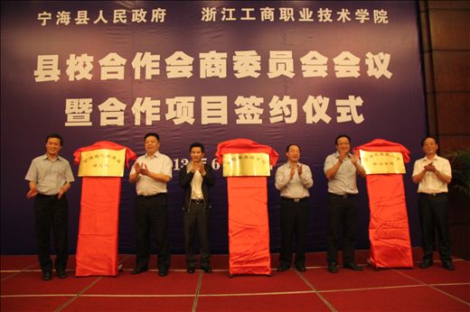 随后,蔡玉林和胡赤弟,卡吉安和蔡泽伟,褚银良和谢一风,分别为徐霞客旅游学院、宁海现代服务业发展研究院、宁海高技能人才培训学院揭牌。此次合作标志着我校与宁海县之间的县校合作翻开了全新的一页,是我校在实现提升高职院校科技创新能力和服务经济社会发展能力方面又一个里程碑。