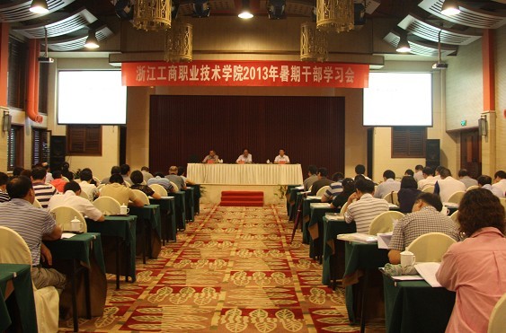 | 8月19日-22日,学校举行2013年暑期干部学习会,学校领导、全体中层干部参加了学习会。华东师范大学博导、上海电机学院院长夏建国,杭州滨江高教园区管委会办公室主任朱鸿飞应邀到会作专题报告。会议期间还举行了学校党的群众路线教育实践活动动员大会,省商业集团公司组织人事部副部长黄胜泉、宁波市教育局纪工委监察审计处副调研员马军等督导组成员出席动员大会。