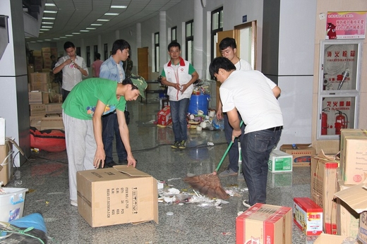 志愿者们被分成三批分头行动。第一批50人在余姚市职成教中心学校(余姚最大的救援物资中心)装卸水、面包、泡面等救援物资;第二批30名男生跟随老师乘坐大卡车前往市区;第三批20人前往水泥厂装卸物资的同时还清理了周围垃圾。 台风虽已过境多日,但是连日的积雨仍未退去,积水深达70厘米,在当地社区干部的帮助下,同学们踩着由桌椅搭成的“便桥”进入了社区服务中心,与前来交送物资的部队官兵组成“流水线”把整整三大卡车的救灾物资搬运到社区安置点,短短几十分钟的时间他们已汗流浃背,通红的脸颊布满汗水,却无暇顾及,全力地奉献着自己微薄的力量。
