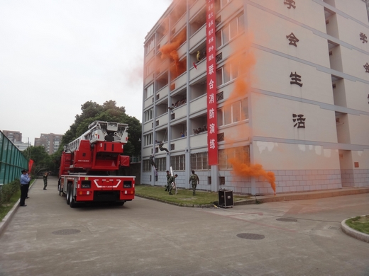 | 10月17日下午14时30分左右,一股刺鼻的烟雾从学校A号宿舍楼4楼滚涌而出,火势迅速扩大,楼内多名学生被困。学校、消防部门迅速展开救援。登高车、缓降器和软梯等设备一一到位,不到10分钟,数百名正在上课被困的师生成功脱险……这紧急的场面是我校正在开展2013级全体学生消防演习活动。 本次消防逃生演练是由我校和鄞州区古林消防中队、2013级学生施训部队东海舰队联合举行的。宁波市公安局严敏等警官及学校党委书记蔡泽伟、校长谢一风、副校长徐永春等相关领导到现场进行了指导, 学校预演工作领导小组、军训工作领导小组全体成员以及近3400名师生进行了现场观摩学习。