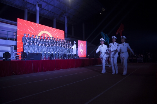 | 10月17日晚,我校在田径场举办了“青春启航 梦圆工商”2013年迎新生文艺晚会。本次晚会由学工部、校团委主办,各分院、校学生会、社团联合会承办。军训团团长、东海舰队司令部军务处主任秦大伟,东海舰队司令部宣传办主任张小青,军训团副团长、东海舰队司令部军务处参谋马强,军训团参谋长、东海舰队训练基地参谋马金成;以及我校党委书记蔡泽伟,党委委员、纪委书记、工会主席李振祥,副校长徐永春,校党委委员、组织人事部部长邱素芬等领导和嘉宾、东海舰队的全体教官出席了晚会,我校全体2013级新生参加了本次活动。