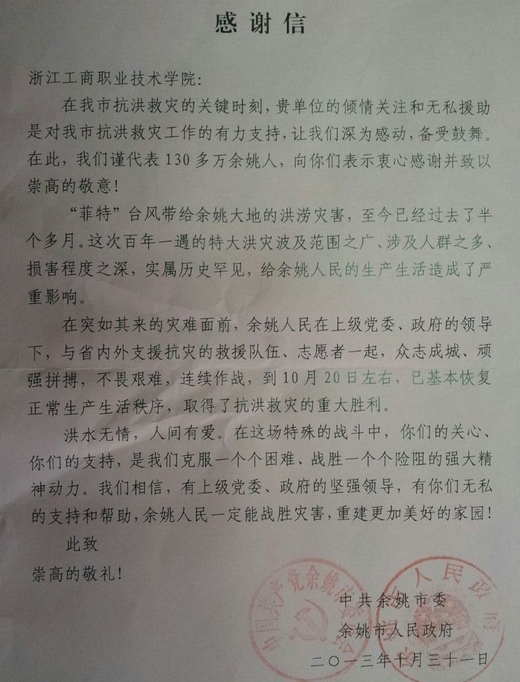 余姚市委市政府给我校发来感谢信