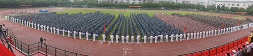 | 9月14日上午8:30,2014级学生开学典礼暨军训开训仪式在学校田径场举行。承训部队首长东海舰队司令部军务处处长王斌、主任秦大伟和宁波市海曙区人武部部长路德峰,我校党委书记蔡泽伟、校长姚奇富、党委副书记应金萍、纪委书记李振祥、副校长俞位增、徐永春、党委委员邱素芬及相关部门负责人出席了仪式并在主席台就座,全体教官、辅导员、2014级新生班主任、班级助理以及2014级全体学生参加了仪式。 开训仪式上,蔡泽伟首先向军训团授团旗,标志着校2014级学生军训正式拉开了帷幕。