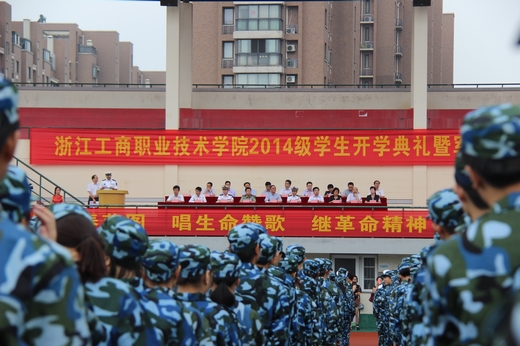 主席台领导还为新生代表佩戴校徽;班主任、新生班级助理为所有新生发放校徽。随后,老生代表王铭同学和新生代表章静巧同学也分别在开训仪式上发言。教官代表陈倩也庄严承诺,将以饱满的热情投入到军训工作中,高标准、高质量完成军训任务。 最后,军训工作领导小组组长、学校党委副书记应金萍宣布2014级学生军训正式开始。