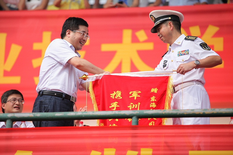 军训工作领导小组副组长、学工部、武装部部长励业宣读了表彰决定,对160名军训个人标兵、92个军训标兵寝室、12个优秀班集体、20名军训先进工作者及先进集体进行了表彰。 最后,姚奇富代表我校向东海舰队司令部军务处赠送锦旗,感谢他们对我校2014级学生军训工作的大力支持。