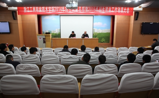 | 12月3日下午,我校2014年招生就业工作总结暨2015年招生就业工作动员大会在图书馆报告厅召开,校长姚奇富、校党委副书记俞位增出席了会议,学校相关部门负责人、各专业(群)主任副主任、2014年招生宣传人员、各学院招生工作联络人、各学院就业工作指导人员也参加了此次会议,会议由俞位增副书记主持。 会上,商学院、电子与信息工程学院、建筑与艺术学院、国际交流学院、机电学院分别对今年的招生就业工作进行了总结,招生就业处相关负责人代表学校作了2014年招生就业工作总结汇报,详细介绍了我校2014年招生就业情况和2013届毕业生跟踪调查情况,分析了今年招生就业工作中存在的问题,并提出了针对性的对策和建议。