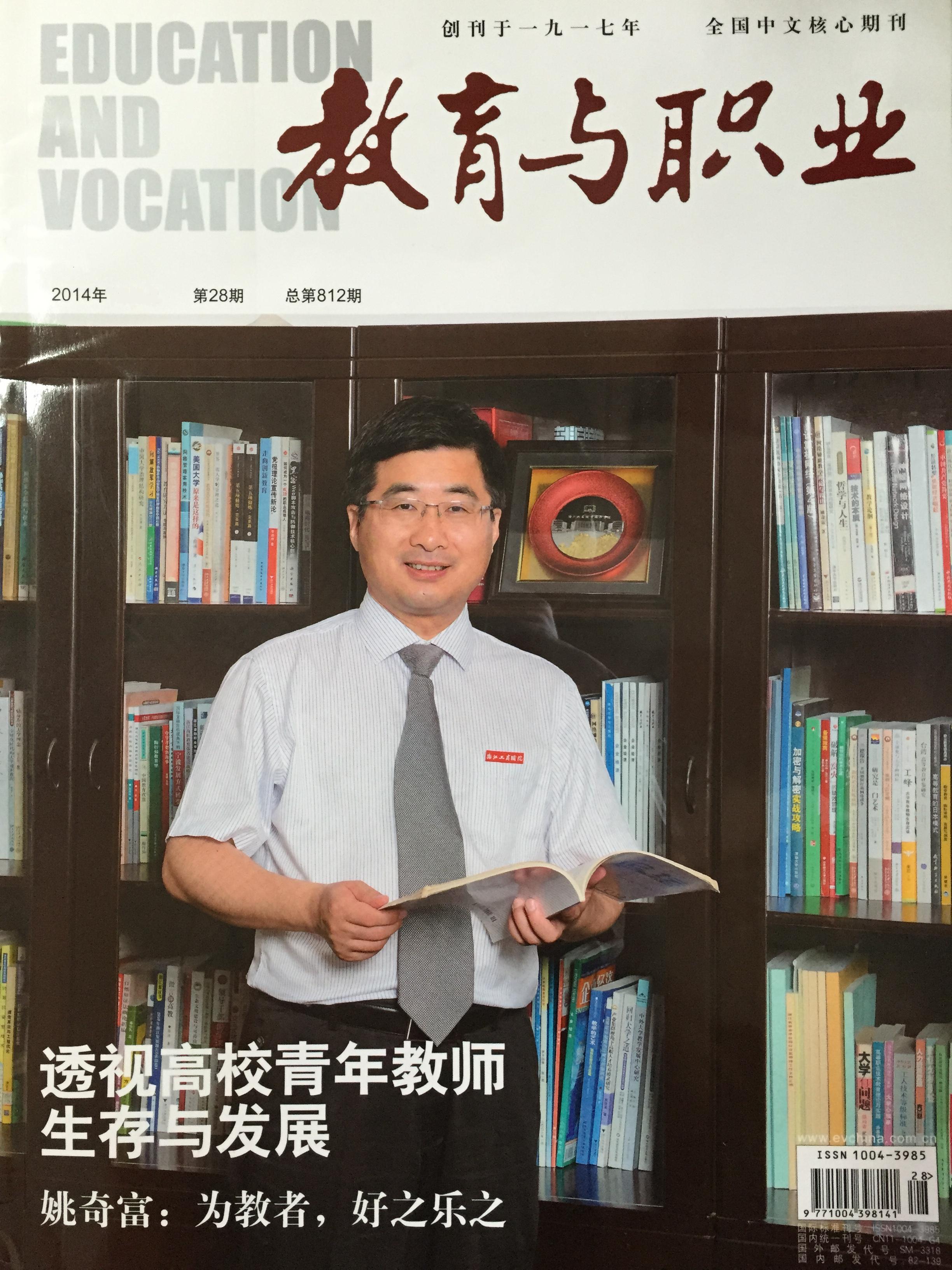 | 近日,全国中文核心期刊《教育与职业》杂志专门对我校校长姚奇富进行了专访,并以6088字4个版面的大篇幅对姚奇富校长进行了题为《姚奇富:为教者,好之乐之》的专题报道,更难得的是姚奇富校长还被杂志社选为封面人物,刊登在《教育与职业》杂志的封面上,引起了社会上较大反响和广泛关注,这不仅是对我校教育管理的肯定,也有助于进一步提升我校在全国的社会影响力和美誉度。 全国中文核心期刊《教育与职业》人物专访栏目 2014年第28期 总第812期