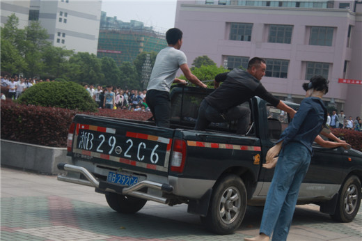 13时,一辆皮卡车从学校前门欲进入学校时被前门执勤的校卫队员拦下检查,此时轿车突然加速撞毁前门的栏杆后,车上1名歹徒忽然拿出大砍刀挥舞乱砍,闯入校区,接连撞倒4名行人并投掷炸弹……接到校卫队员报告后,学校立即启动《浙江工商职业技术学院处置暴力恐怖事件应急预案》,演练就此展开。 歹徒车辆停在图书馆前,从车上冲下4名歹徒,1名歹徒手持油桶,意欲烧毁图书馆,被我校追赶而来的校卫队员制服。另1名歹徒手持砍刀开始对广场的学生进行砍杀,被支援的校卫队员围困住。我校各应急小组,按照预案分工,有条不紊的对现场及人员进行安全保卫、现场疏导、救护保障等工作。
