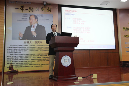 | 5月30日上午,由我校和浙江在线宁波站、上海交通大学校友会宁波分会联合主办的21世纪海上丝绸之路宁波新媒体论坛第五讲在我校中和楼开讲,宁波信远工业集团有限公司董事长,高级工程师袁奕琳先生发表题为《创新与一带一路》的主题演讲。我校副校长徐永春、纪委书记邱素芬出席此次论坛,论坛由浙江在线-宁波在线总编兼总经理陈国�主持。