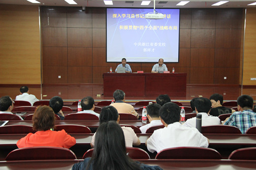 | 6月3日下午,浙江省委党校郭祥才教授应邀来我校作了题为《深入学习总书记系列重要讲话,积极贯彻‘四个全面’战略布局》的专题报告。党委书记蔡泽伟、党委副书记俞位增、纪委书记邱素芬、校长助理张启富,全体中层干部及相关人员共100余人听取了讲座。报告会由俞位增主持。