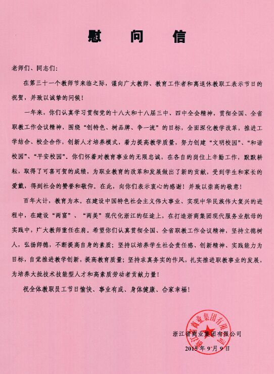 值此第31个教师节来临之际,浙江省商业集团有限公司向我校发来慰问信,祝愿我校全体教师和教育工作者节日快乐!慰问信全文如下: