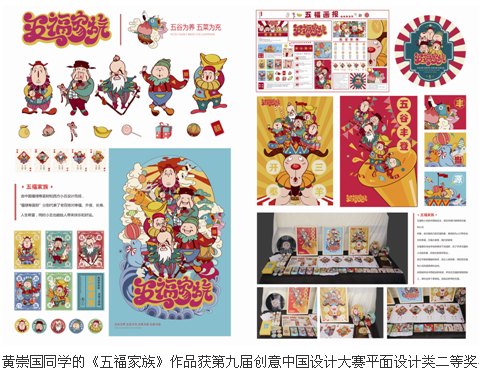 | 近日,从2015第九届创意中国设计大奖组委会获悉,我校建筑与艺术学院广告设计专业选送的9件参赛作品在此次大赛中共获9个大奖,其中胡巍、方艳老师指导的黄崇国同学的《五福家族》整体形象设计作品获得了平面设计类二等奖;陈�华同学的海报设计作品《风调雨顺》、周雅妮同学的海报设计作品《手机》均获得了平面设计类三等奖;另外6位同学的设计作品均获得了优秀奖。同时胡巍、方艳老师还获得了“优秀指导教师”称号。