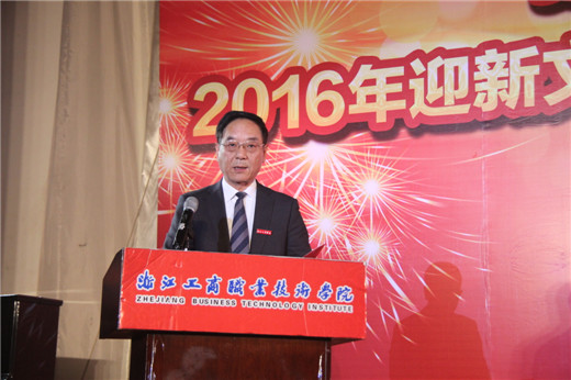 蔡泽伟首先致新年贺词,他简要回顾了学校在即将过去的2015年所取得的成绩,指出2015年是不平凡的一年。在这一年里,我校全体师生践行校训,同心同德,同舟共济,取得了教书育人的丰硕成果。同时学校开拓创新,真抓实干,以学校十件实事为突破口,切实为广大教职员员工解决了如报销、就餐、沟通机制、一体化考核、疗养、校园环境整治等方面的实际问题,以三严三实主题教育活动,明确三个清单,实行了公务用车改革,大力推进综合改革,全面启动十三五规划编制,学校的精神文明建设、党风廉政建设和基础设施建设、招生就业、教学和学生管理工作井然有序,各项改革稳步推进,教学质量明显提高,办学条件明显改善,全校上下形成了良好的干事氛围。同时,他还指出,作为学校特色品牌活动,科技文化节一直在营造校园科技文化氛围,强化专业知识应用,促进优良校风学风,增强学生创新创业能力方面发挥着重要作用,在全校范围内形成了“科技创新展风采,修德砺能促发展”的良好氛围。他最后希望全体教职工站在2016年新的历史起点上,坚持以内涵发展为重点,以立德树人为根本,以创业就业为导向,不断推动学校办学活力与社会竞争力增强。在新的一年来,为实现学校新的奋斗目标而共同努力,为学校发展再谱新篇!