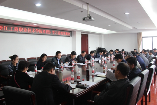 | 4月12日,学校章程建设领导小组在中和楼314组织召开了《浙江工商职业技术学院章程》(以下简称《章程》)学习总结交流会,学校党委书记蔡泽伟、校长、党委副书记姚奇富、副校长徐永春出席会议,学校各职能部门、二级学院(部)负责人参加了交流会。 在本次《章程》学习交流会上,各职能部门、二级学院(部)负责人汇报了所在部门组织学习《章程》的情况,所在部门制度建设情况,并对照《章程》,结合部门职责对部门现有规章制度进行梳理,并就所在部门相关工作提出改进措施和建议。 蔡泽伟指出,《章程》是学校的基本法,是十八大提出的依法治国在学校的具体实践。《章程》涉及到学校的历史、文化、理念、特色,是权威的表述,将指导我校的长期发展。我们要依据《章程》,处理好学校内部行政与学术、学校和学院的关系,学校外部学校与政府、行业、企业的关系,以及对外交流与合作等,下一步要考虑把《章程》细化、落地。他还提出了三点建议:一是制定制度和执行制度不要两张皮,要有法治思维,制度的制定不能和《章程》相违背。学与做不要两张皮,学要带着问题来学,做要针对问题来改,做与学要紧密结合起来;二是要有部门负责审核、监督、评判现有制度,注意制度之间的关联性和交叉问题,真正做好制度建设,实现依法治校;三是要在阳光下操作,党务、校务要公开,制度建设要及时跟进。