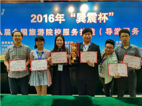 | 近日,在广东省举办的“巽震杯”第八届全国旅游院校服务技能(导游服务)大赛落下帷幕,我校学生从全国300余所高等院校的500名选手中脱颖而出,获得非常优异的成绩。其中,13级旅游管理专业的徐本刚同学获得中文组一等奖,并以精彩的才艺表演获得个人最佳才艺奖;14级旅游管理专业的姜婉莹同学和15级旅游管理专业的郑鑫蕊同学获得了英文组三等奖;13级旅游管理专业的徐翔同学获得了中文组优胜奖。旅游管理专业的熊国铭和丁春文两位老师也在此次大赛中被评为优秀指导教师。