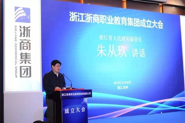 | 12月30日,浙商职业教育集团成立大会在杭州隆重举行。省人民政府副省长朱从玖,省国资委主任、党委书记冯波声,省国资委副主任朱恒福,省教育厅副厅长朱鑫杰,省商务厅副厅长徐高春,省工商局副局长马剑平,省旅游集团董事长、党委书记方敬华,物产中大集团董事、党委副书记宋宏炯,省国贸集团董事、党委副书记楼国庆,省商业集团董事长、总经理张波,省商业集团党委书记陈鹰,副总经理叶晓英、蔡玉林,我校及浙江商业职业技术学院、浙江商业技师学院三所学校的校级领导,省商业集团所属企业负责人,以及来自省内政府、行业协会的领导和嘉宾,省内外知名企业负责人,国内外教育机构负责人等,共120多人出席大会。 会上,朱从玖发表重要讲话,省国资委、省教育厅、省商务厅和省商业集团的领导分别致辞。 朱从玖代表省政府对浙商职教集团正式成立表示祝贺,希望浙商职教集团为我省国有企业转型升级、支持社会事业发展打造新样板、树立好榜样。 他指出,发展现代职业教育,提升人口素质,是打造浙江经济“升级版”的迫切需要;国资国企兴办职业教育,是深化国企改革、优化国资布局的重要安排。近段时间,省属企业杭钢集团、机电集团、商业集团相继在职业教育领域发力,积极探索国有企业集团化兴办职业教育新模式,意义重大、前景广阔。推动省商业集团等一批省属企业积极参与兴办职业教育,一方面积极参与优化职业教育体制机制,统筹现有职教资源、加大职教投入、激发办学活力,建立更为紧密的校企合作、产教融合的新型办学模式,是一种有益尝试。另一方面,也是按照省委提出的要努力补齐制约发展最关键、百姓需求最迫切的短板的要求,提高职业教育的能力。 他强调,办学的各企业集团要充分发挥自身独特优势,有效积聚各类职教资源,促进集团成员深度合作和协同发展,逐步建立起体制机制健全、资源高效配置、产教深度融合的运作体系,有效提升服务国家“互联网+”、“一带一路”、精准扶贫战略和我省经济社会发展的能力和水平,努力成为在全省有吸引力、在长三角有辐射力、在全国乃至国际上有影响力的浙江职业教育品牌,为国有企业参与社会事业发展走出一条新路。 他要求,办好职业教育要有国际化眼光,深度融入世界经济社会发展进程,实现人才培养标准与国外先进标准的对接;要深化改革,创新体制机制,建立健全职责明确、统筹有力、运转高效的运行机制,不断增强职教集团整体实力和发展后劲;国有资本、国有企业要积极探索参与教育、医疗、养老、体育、环保等社会民生事业领域,积极发挥国有资本的示范、引领和放大功能,创新运行管理机制,提供更多更优服务,着力打造浙江国资国企改革新名片,形成浙江国资兴办社会事业的品牌效应,不断增强我省国有经济活力、控制力和影响力,为早日建成高水平全面小康社会贡献智慧和力量。