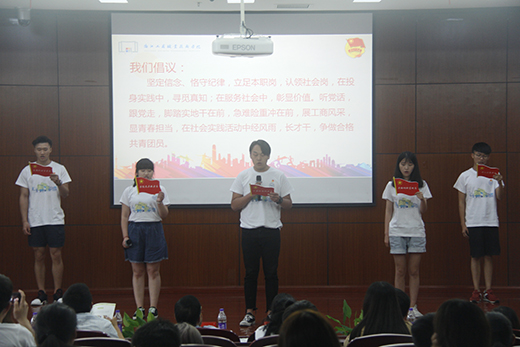 | 6月26日下午,我校大学生“听党话 跟党走 青春喜迎十九大”暑期社会实践出征仪式暨“一员双岗双建功”推进大会在中和楼217举行。副校长应晓清,海曙团区委副书记曹小波,校党委委员、党委宣传部部长谢骏,学工部、团委、厚德书院负责人,各学院党总支书记以及辅导员代表、社会实践指导老师、学生代表出席会议。 应晓清与曹小波分别代表学校和海曙团区委签订《校地实践育人合作协议》。下一阶段,我校与海曙团区委将围绕省市区中心工作,充分发挥学校人才资源优势,开展企业调研、社区服务、环境保护、三下乡服务、志愿服务等社会实践工作。今后,双方将进一步整合资源,为“社会岗”与学校之间的衔接提供更多便利,建立社会实践合作共建长效机制。