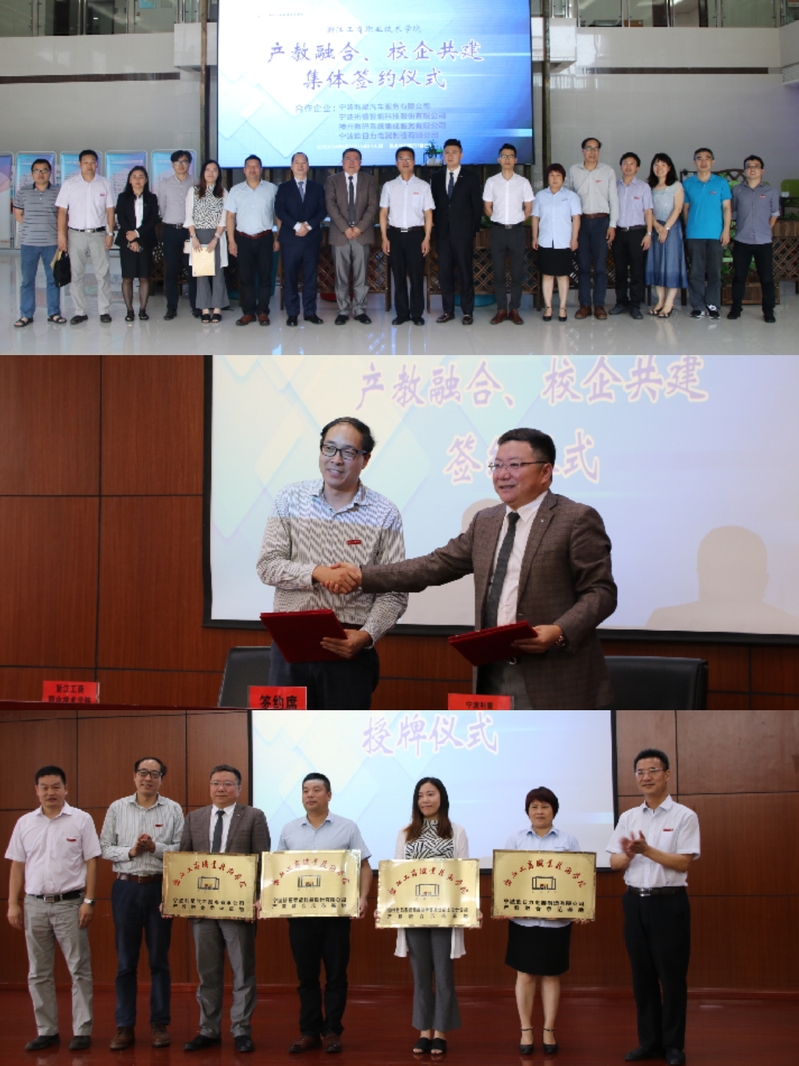 6月21日,我校与宁波利星汽车服务有限公司、宁波祈禧智能科技股份有限公司、神州数码系统集成服务有限公司、宁波欧日力电器制造有限公司四家公司隆重举行“产教融合•校企共建”集体签约仪式。企业方总经理张厚才、刘坤和人事部经理杨忠、车思源,我校党委副书记、副校长周志春,教务处和智能电子学院、汽车服务学院负责人,现代学徒制试点班学生,以及相关负责老师、企业指导师傅等共计200人参加。