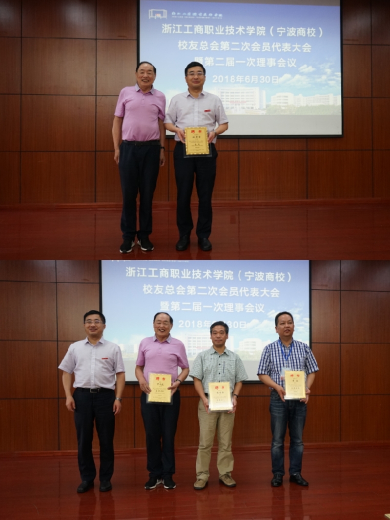 资深校友代表原任职浙江经济高等专科学校的罗允尧校友为校友总会会长姚奇富颁发聘书。姚奇富分别为校友总会名誉会长、副会长、常务理事、秘书长颁发聘书。党委委员、副校长徐盈群为校友总会副秘书长颁发聘书。校友总会秘书长(常务理事)楼晓东为理事代表颁发聘书。党委委员、副校长应晓清和党委委员、校长助理张启富分别为创业导师和客座教授校友颁发聘书。