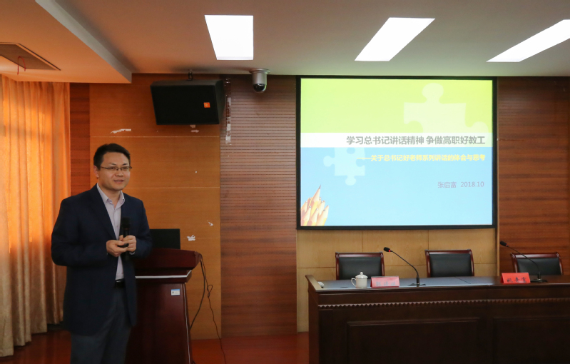 开班典礼后,张启富为与会的学员做了题为《学习总书记讲话精神、争做高职好教工》的专题培训。