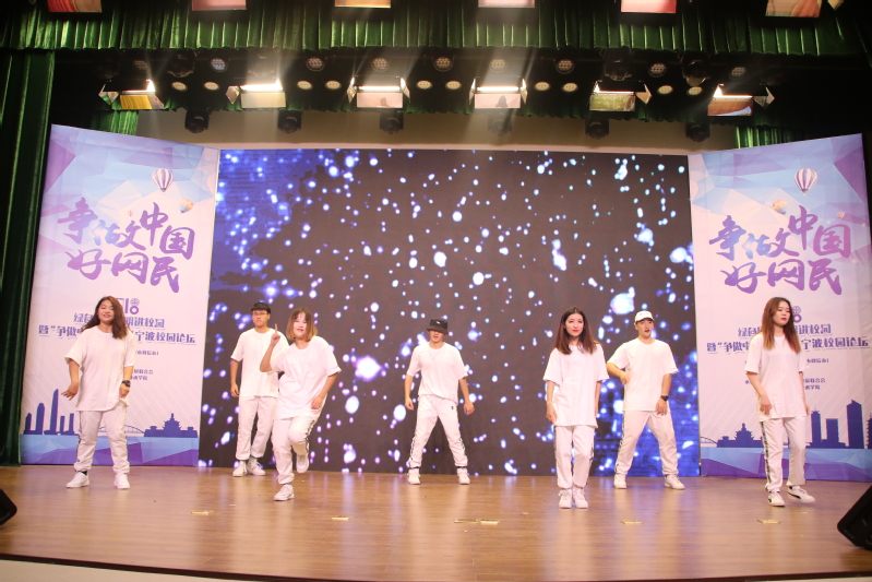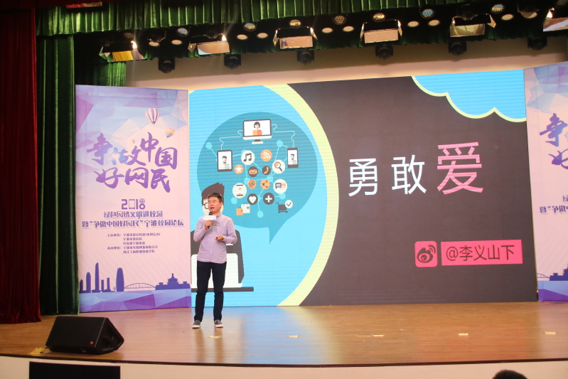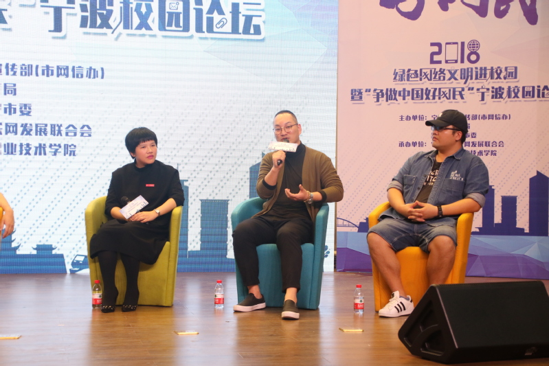 “校园论坛”环节由宁波足迹创始人小米主持。当嘉宾走上舞台时,全场的气氛达到高潮。周奇、秦涛、张臻、陈默以及我校全媒体中心指导老师胡晓虹就“如何争做中国好网民”“宁波如何打造网红城市”“我为宁波代言”“互联网影视如何与地方传统文化融合”“宁波网红美食”等话题与现场师生进行分享。