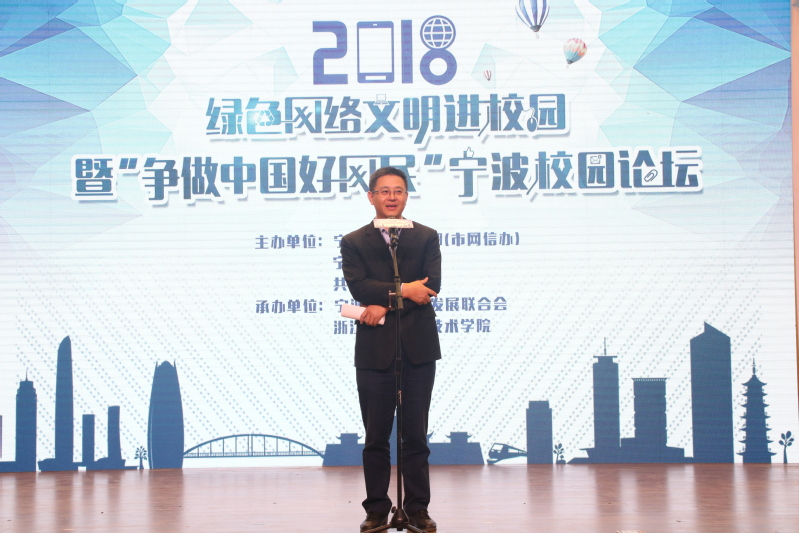 俞位增致欢迎辞,他指出,2018“绿色网络文明进校园”暨“争做中国好网民”宁波高校论坛活动如期在我校举行,是上级有关部门对我校的信任和鼓励,更是我校网络文化建设的一次难得宝贵机会,相信这次活动的成功举行必将有力促进我校的校园文化建设。