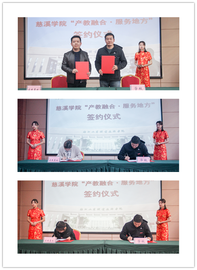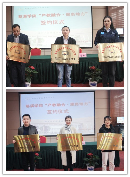 仪式最后,慈溪学院实训基地负责人与宁波德曼压缩机有限公司、宁波培厚电子科技有限公司和慈溪光美电子有限公司等三家企业签订了产学一体工作室合作协议,并由孙剑波向三个工作室授牌;慈溪学院党总支副书记与慈溪市桥头镇团委、慈溪市科技馆和慈溪市皮肤病医院等三家实践基地合作单位签订了大学生实践基地合作协议,并由胡列年向三家实践基地授牌。