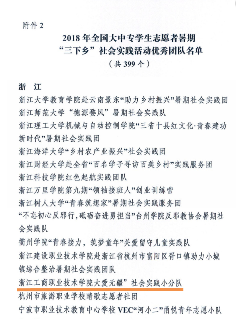 近日,团中央学校部与全国学联秘书处表彰了一批在2018年全国大中专学生志愿者暑期“三下乡”社会实践活动中表现突出的399个优秀实践团队。其中,由校团委推荐的“大爱无疆”暑期社会实践小分队也名列其中。