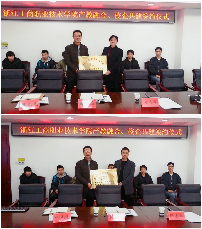 在随后举行的集体签约仪式上,教务处负责人代表学校分别与两企业进行签约,周志春颁发“产教融合示范基地”牌匾。