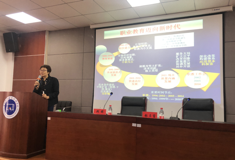 邢晖教授围绕新时代职业教育若干重点热点问题,抓住5个“新”,从“职教新时代、职教新质量、校企新合作、职教新体系、职教新治理”等5个方面阐述了新时代高等职业教育的新常态。邢教授首先深入分析了我国职业教育发展轨迹,传达了教育大会最新有关精神,指出我国职业教育已进入了新时代。随后,她运用 “142”要素框架,即1个根本:立德树人;4个关键:专业(群)建设、课程建设、师资建设、实训基地;2个结点:校企合作、信息建设系统,深入分析了新时代职教新质量的影响机制。此外,她还就我国职校校企合作的关键问题、难题及未来走向,对构建我国现代职业教育新体系和高等职业运行治理方式提出了理论与现实建议。