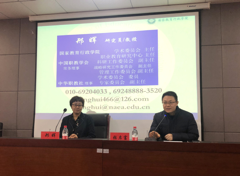 12月14日下午,我校特邀国家教育行政学院教育行政教研部主任、职业教育研究中心主任邢晖教授来我校作题为“高等职业教育热点焦点问题”的学术讲座。全体中层干部,各专业负责人、基层教学组织负责人、实训基地主任以及40多名一般管理与服务人员听取了专题讲座。讲座由党委委员、校长助理张启富教授主持。