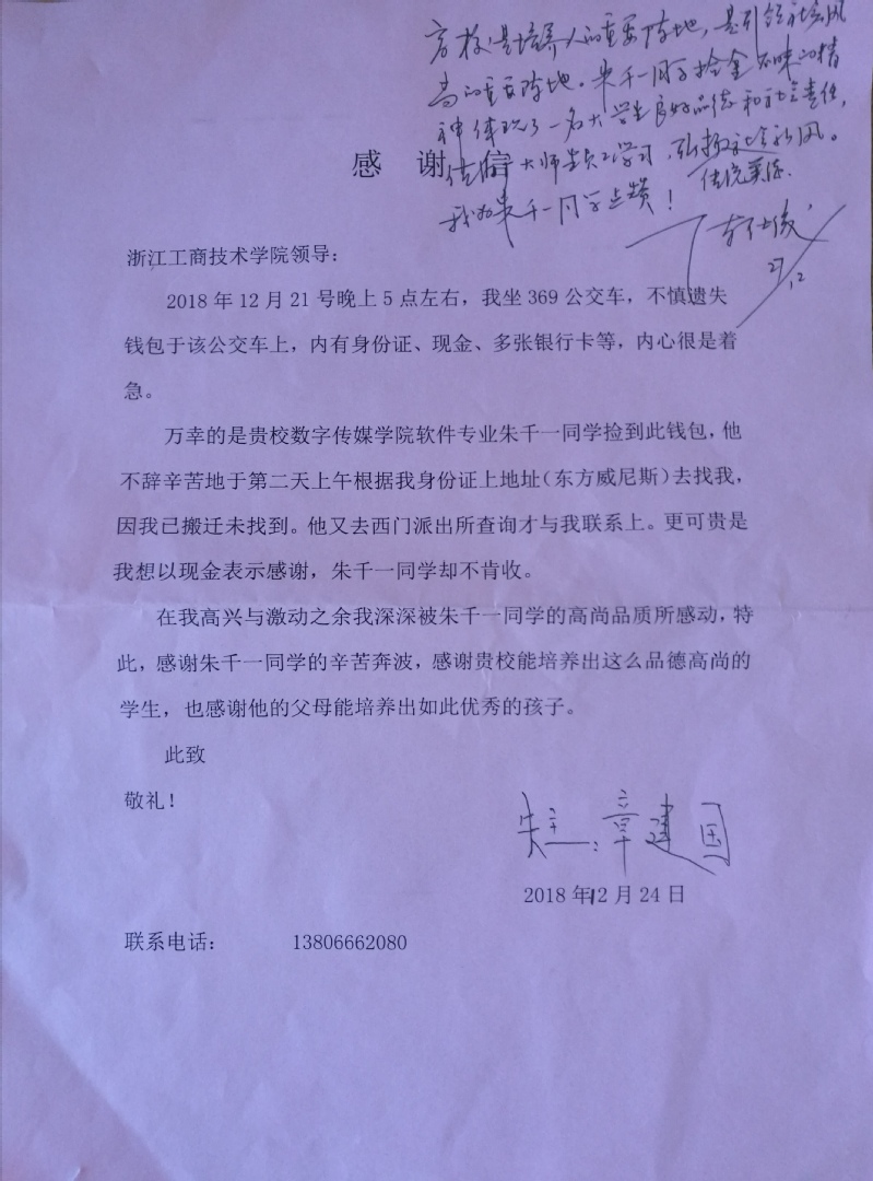 近日,学校党(校)办收到了一封来自宁波市民章老伯的感谢信,对数字传媒学院软件1741班的学生朱千一拾金不昧的行为表示诚挚的感谢;也就在近期,我校青年志愿者者、建筑工程学院智能1841班学生林礼嘉祖孙三代传承志愿者精神,无私奉献服务他人的感人事迹在宁波电视台看看看栏目播出,两位同学的先进事迹还先后在凤凰网宁波、中国教育在线、浙江在线、浙江新闻、宁晚融媒等众多重要主流媒体报道,向全社会展现了工商学子的良好形象,传递了满满的正能量。