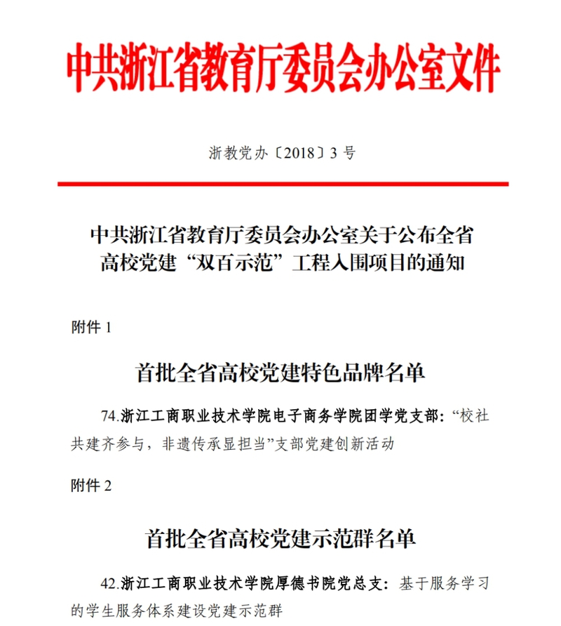 近日,浙江省教育厅公布了全省高校党建特色品牌、示范群“双百示范”工程项目的遴选结果。此次活动共收到各高校党委遴选报送的147个特色品牌、93个示范群候选项目。经组织专家评审,厅党委会研究,105个特色品牌和60个示范群入选全省高校党建“双百示范”工程项目。其中,我校电子商务学院团学党支部“校社共建齐参与,非遗传承显担当”支部党建创新活动成功入围首批全省高校党建特色品牌名单,厚德书院党总支“基于服务学习的学生服务体系建设党建示范群”入围首批全省高校党建示范群名单。