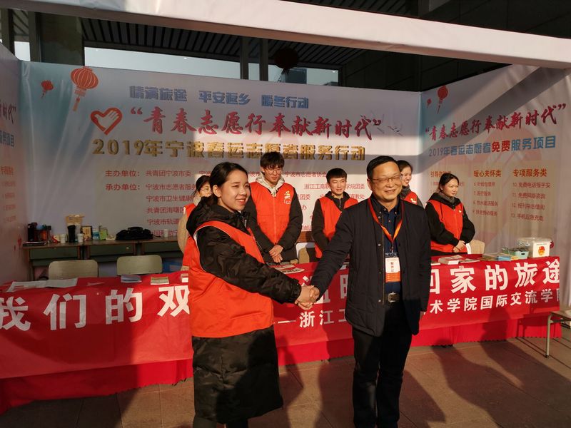 1月23日下午,党委委员、副校长应晓清一行前往铁路宁波站、宁波栎社国际机场看望、慰问奉献在春运第一线的我校“暖春行”志愿者。