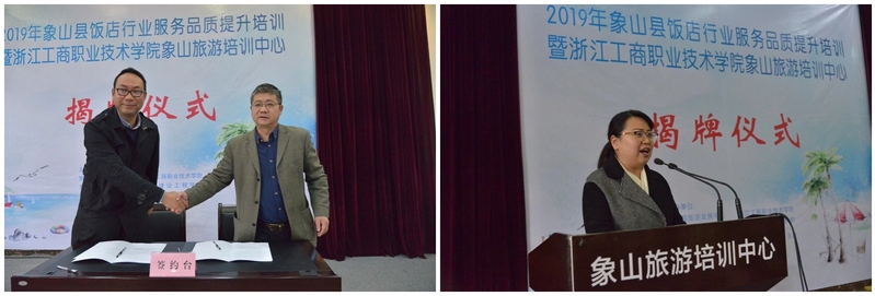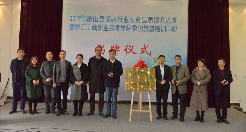 近日,副校长徐永春、科研与社会服务处处长楼晓东、国际交流学院、旅游与健康学院党总支书记董静、旅游管理专业主任熊国铭等一行6人前往象山参加2019年象山县饭店行业服务品质提升培训暨浙江工商职业技术学院象山旅游培训中心揭牌仪式。本次活动由我校与象山旅游发展中心、象山县教育局、宁波工程建设学校联合主办,仪式在宁波建设工程学校举行。