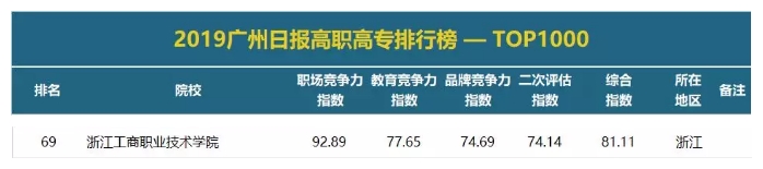 本次排行榜的发布旨在助力培育精益求精的“工匠精神”,打造高职高专评价体系的中国标准。其中“2019广州日报高职高专排行榜—TOP1000”通过对1400所院校的职场竞争力、教育竞争力、品牌竞争力和二次评估指数进行科学评价,得出综合指数,根据综合指数高低确定前1000强院校名单。我校位列第69名,在浙江省同类院校中排行第10名。