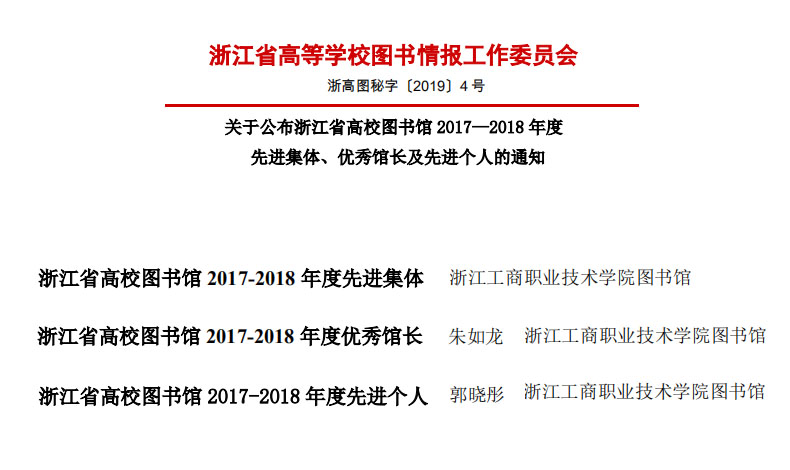 近日,浙江省高等学校图书情报工作委员会在全省范围内开展浙江省高校图书馆 2017—2018 年度先进集体、优秀馆长、先进个人的评选活动,经专家评议和审定,我校图书馆荣获“浙江省高校图书馆 2017-2018 年度先进集体”,这是我校图书馆第一次获得该项重要殊荣。校图书馆馆长朱如龙、馆员郭晓彤还分别荣获“优秀馆长”和“先进个人”的荣誉称号。