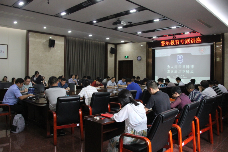 按照集团公司警示教育月“八个一”活动安排,为进一步增强广大领导干部的廉洁意识,6月6日下午,学校举办警示教育专题讲座,特邀宁波市望春监狱法制科警官胡磊作了关于《为人师表显师德 清正廉洁正师风》的专题报告,会议由纪委书记张启富主持。校领导班子成员、中层干部、各党总支纪检委员40余人参加了本次专题讲座。