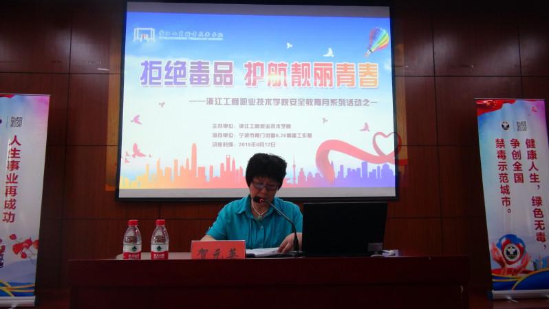 为进一步加强我校毒品预防教育工作,不断提高我校学生的禁毒意识和拒毒、防毒能力,2019年6月12日下午,学校邀请海曙区南门街道“6.26”工作室负责人贺元英在中和楼217为各分院共计200余名学生开展了一场防毒、禁毒知识讲座。