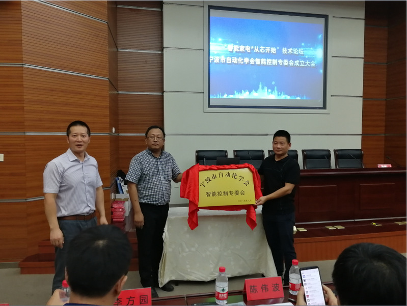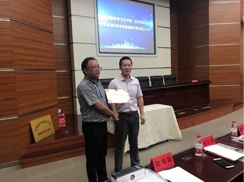开幕式期间进行了智能控制专委会揭牌仪式和颁发聘书等环节,慈溪市光美电子有限公司总经理陆明聪代表专委会接受牌匾和聘书。
