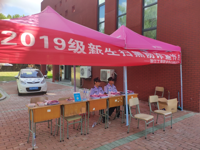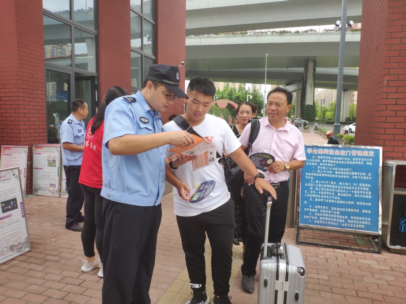 早在7、8月份,利用招生工作契机,保卫处制作并发放内容涵盖防范推销、校园贷等各类电信网络诈骗的新生安全“温馨提示”5000余份,提前给大一新生上了一堂安全课。在9月份新生报到时,又联合古林派出所民警,召集了部分志愿者在校东大门设立“2019级新生扫黑防诈宣传点”,向过往的师生及家长发放各类宣传资料,进行重点防诈知识讲解,并制作了精美的扫黑、防诈展板,进行专题安全宣传,受到了新生及家长的欢迎。