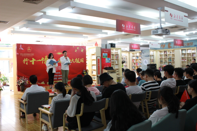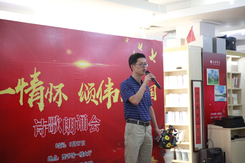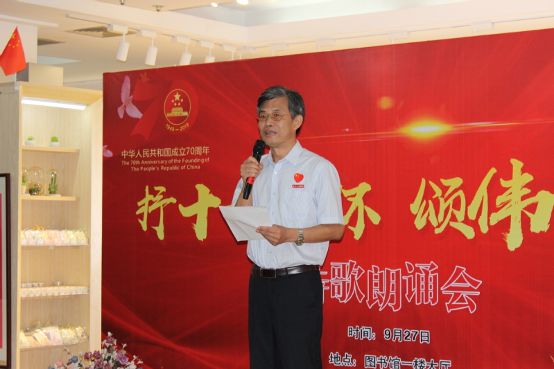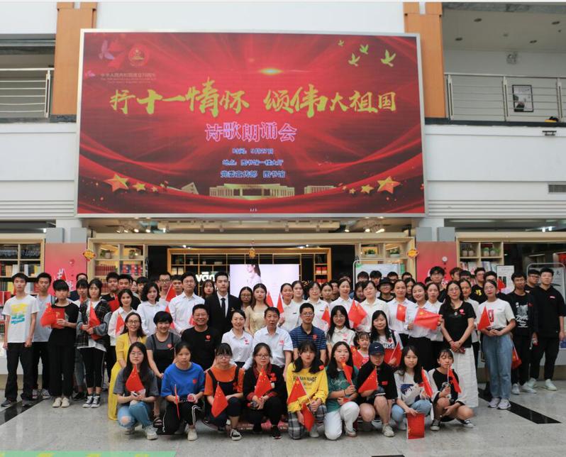 为庆祝新中国成立70周年,激发广大师生爱国情怀,展现蓬勃向上、积极进取的民族精神,发扬工商精神,促进工商书香校园建设,2019年9月27日下午,由宣传部、图书馆主办,海曙区图书馆、公关演讲协会、博闻书社承办,新华书店工商校园店协办的“抒十一情怀 颂伟大祖国”诗歌朗诵会在图书馆一楼大厅举行。