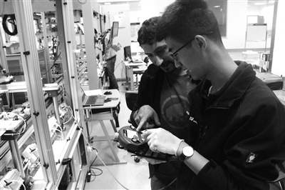浙江工商职业技术学院现代学徒制试点班学员在外籍工程师指导下进行实操。