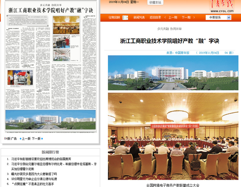 2019年11月4日《中国青年报》第04版整版刊出了题为《多元共融 协同并举——浙江工商职业技术学院唱好产教“融”字诀》一文,报道了我校以产学研合作教育为突破口,不断推进多层次、多渠道合作办学,创建“点、线、面”结合,多元共融、协同并举的产教融合机制的新闻。与此同时,《浙江教育报》也进行了半个版面的大篇幅报道,引起了社会广泛关注,扩大了学校的美誉度和知名度,为全校师生以习近平新时代中国特色社会主义思想为引领,凝心聚力、开拓创新,深入推进产教融合,实施高质量发展战略,奋力谱写新时代高职名校新篇章营造了昂扬振奋的舆论氛围。