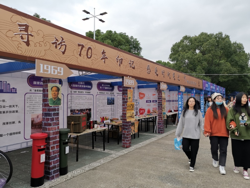 今年是新中国成立70周年,本届校园商品展销会特别开展“寻访70年印记,感受时代变迁”印象70系列展演,安排了70年商品变迁特别展、踢毽子、跳皮筋等经典文体娱乐项目竞赛、70年经典电影赏析、70年服饰秀等活动,在现场刮了一阵怀旧风,带领师生感悟新中国成立后70年的商贸变化,回溯国家与城市商业发展脉络与历程。